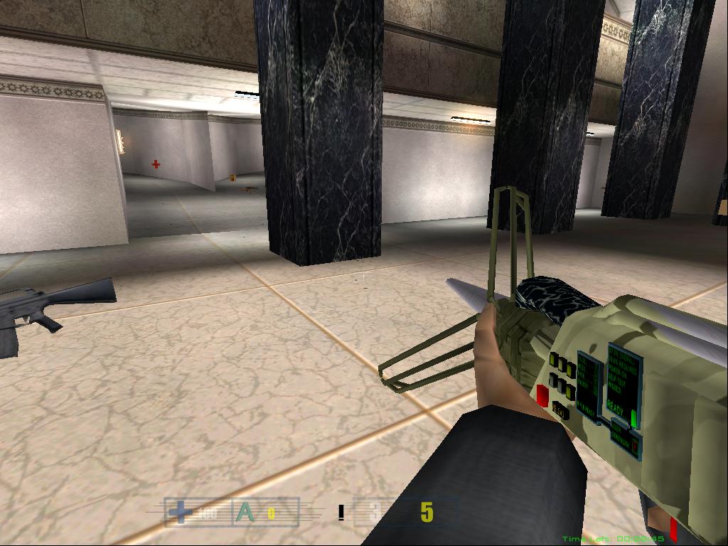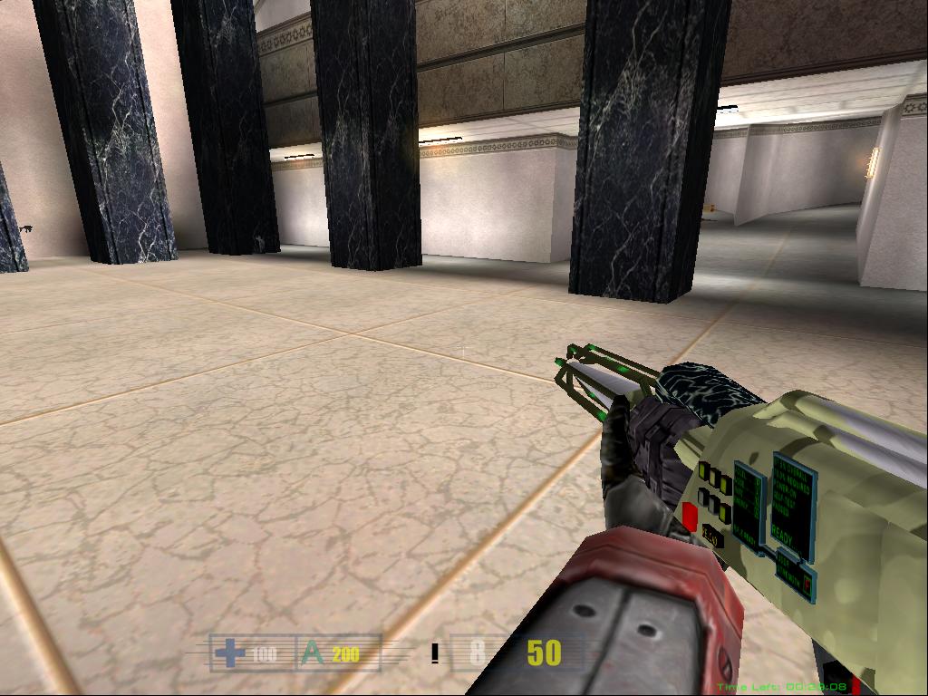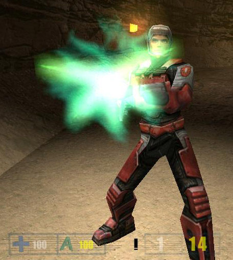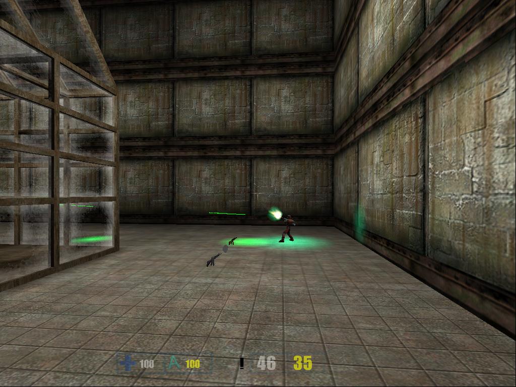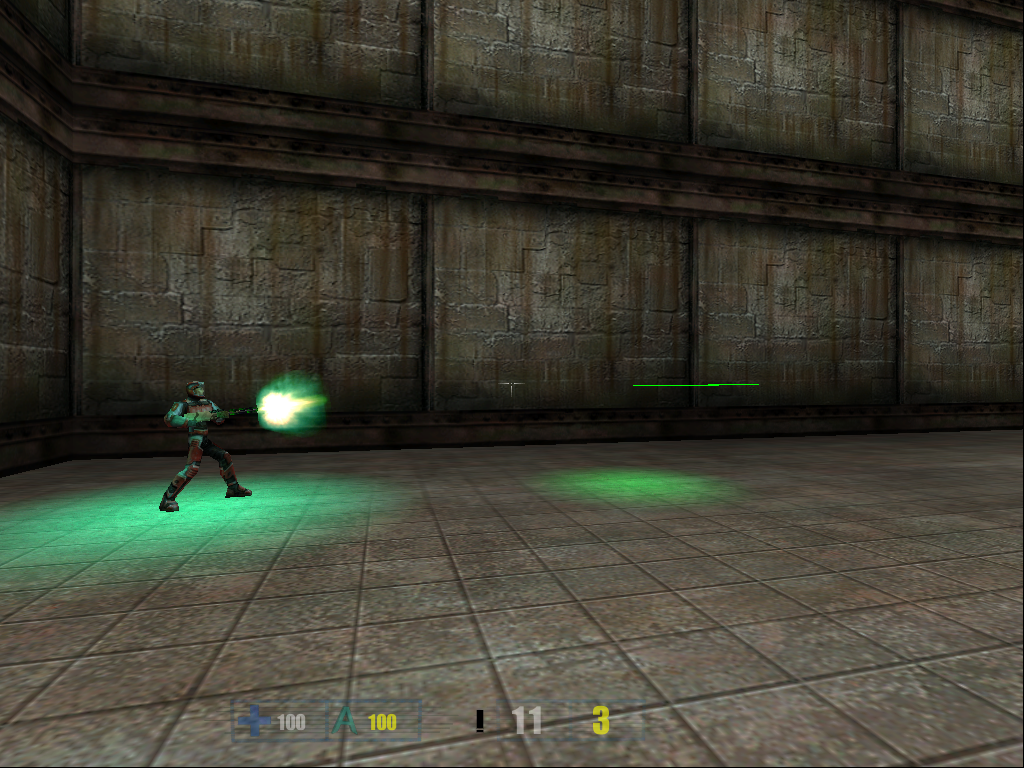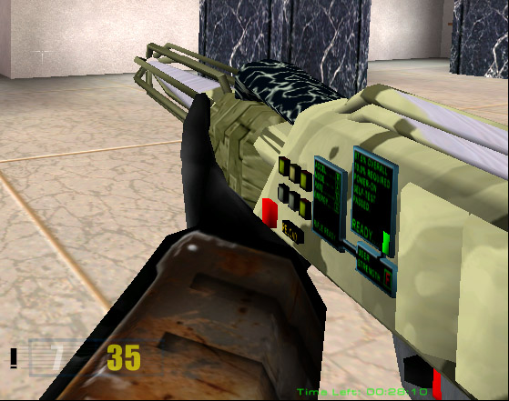 After many tries and retries of getting the right texture for the laser rifle I ended up putting a more standard military look to the rifle. So i finally could put it in RF_bone, cut out unneeded faces and start animating. Some of the textures on the gun are animated, but you will not be able to see them until the next version of Hive will come out >:). Also i'm planning to create some major animations for this gun, so it will look more alive. The laser tracers are done, and i will post more screenshots of the laser rifle in action tommorow, when i will finish the animations. For now, you can take a look at this srcreenshot just to see how rifle looks in the game. I have included both full-scale screenshot, and the cutout version for those with slower connections. Enjoy.