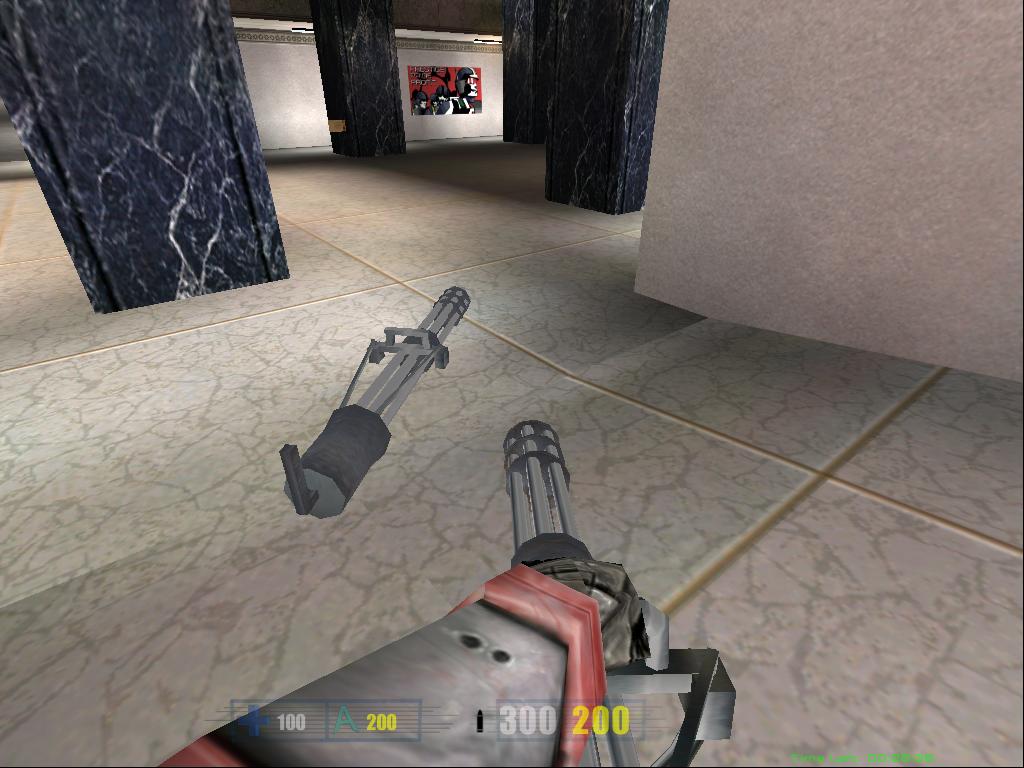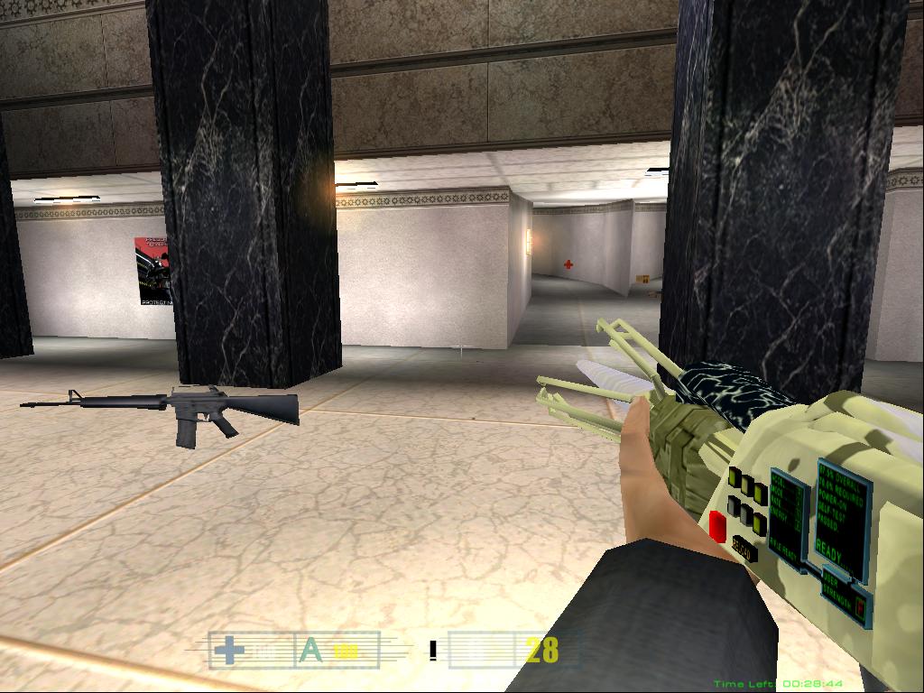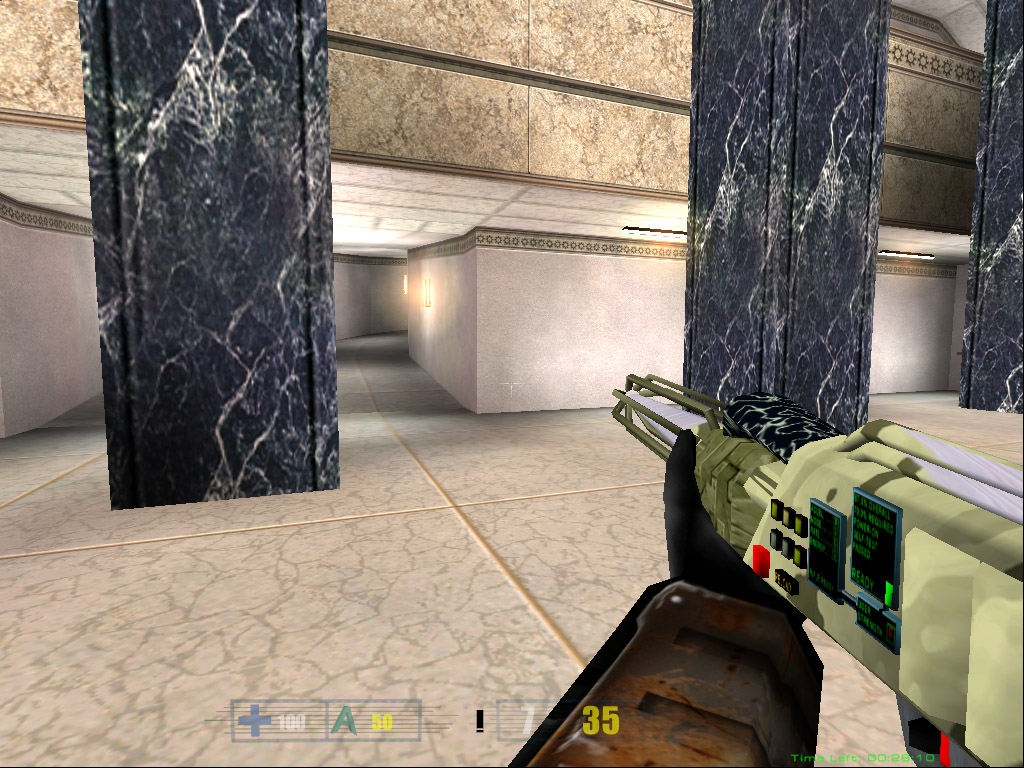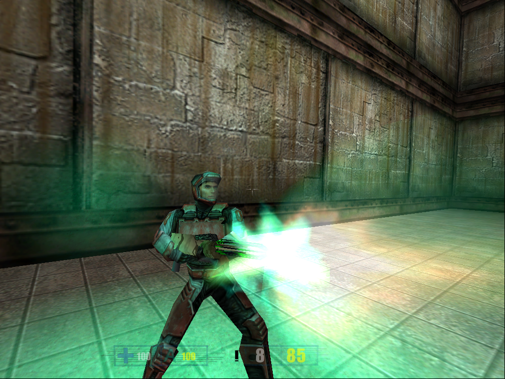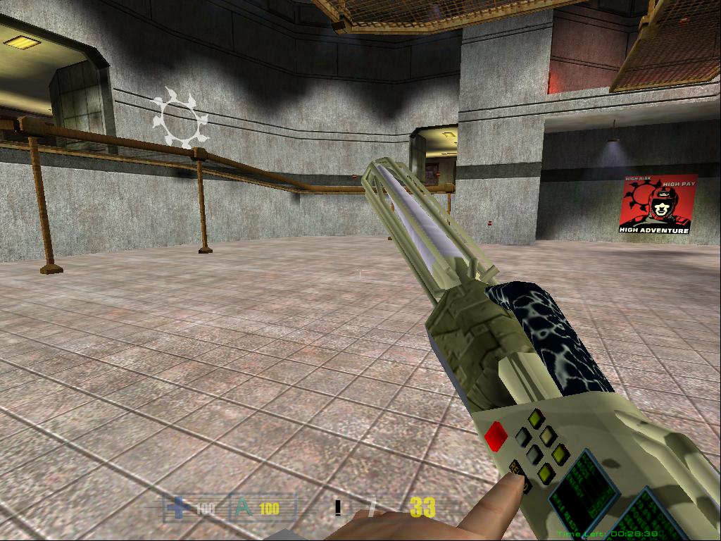 After many tries and retries of getting the right texture for the laser rifle I ended up putting a more standard military look to the rifle. So i finally could put it in RF_bone, cut out unneeded faces and start animating. Some of the textures on the gun are animated, but you will not be able to see them until the next version of Hive will come out >:). Also i'm planning to create some major animations for this gun, so it will look more alive. The laser tracers are done, and i will post more screenshots of the laser rifle in action tommorow, when i will finish the animations. For now, you can take a look at this srcreenshot just to see how rifle looks in the game. I have included both full-scale screenshot, and the cutout version for those with slower connections. Enjoy.
